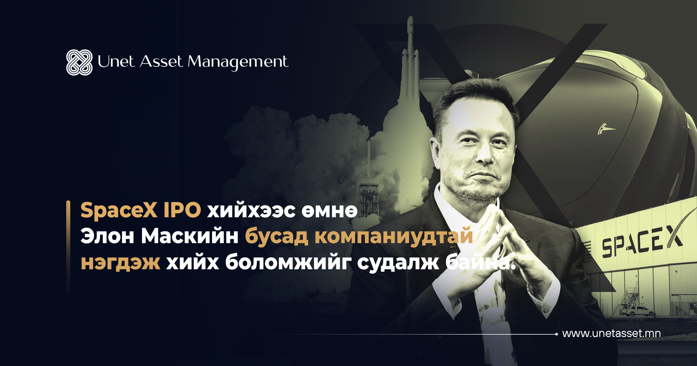 Элoн Маскийн удирддаг SpaceX компани олон нийтэд хувьцаагаа санал болгох (IPO) төлөвлөгөөнийхөө өмнө түүний эзэмшлийн бусад компаниудтай нэгдэх боломжийг судалж эхэлсэн талаар эх сурвалжууд мэдээллээ....